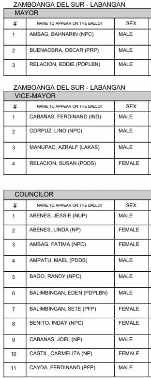 Here is the list of aspiring candidates in the town of Labangan, Zamboanga del Sur (Region 9).