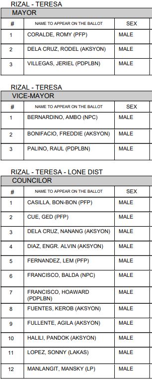 Here is the list of aspiring candidates in the town of Teresa, Rizal (Region 4A).